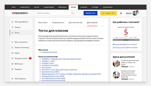 Особенно удобен для учителя подраздел «Тесты для классов». В нём вы можете раздавать тесты для своих классов с вашим полным управлением и контролем. Ученики не смогут пройти тест заранее, не смогут посмотреть ответы и не смогут пройти тест